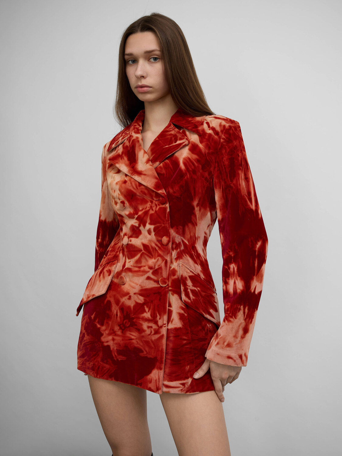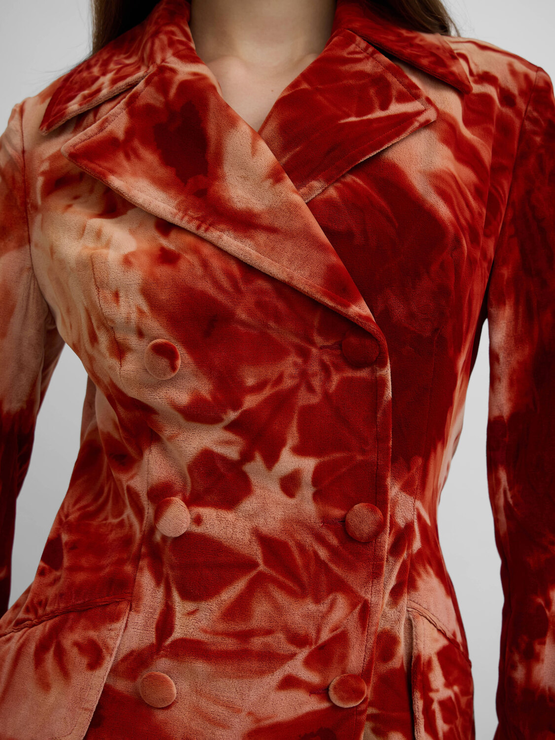 Plein Sud red and peach-tone velvet tie-dye effect double breasted blazer coat with side pockets.