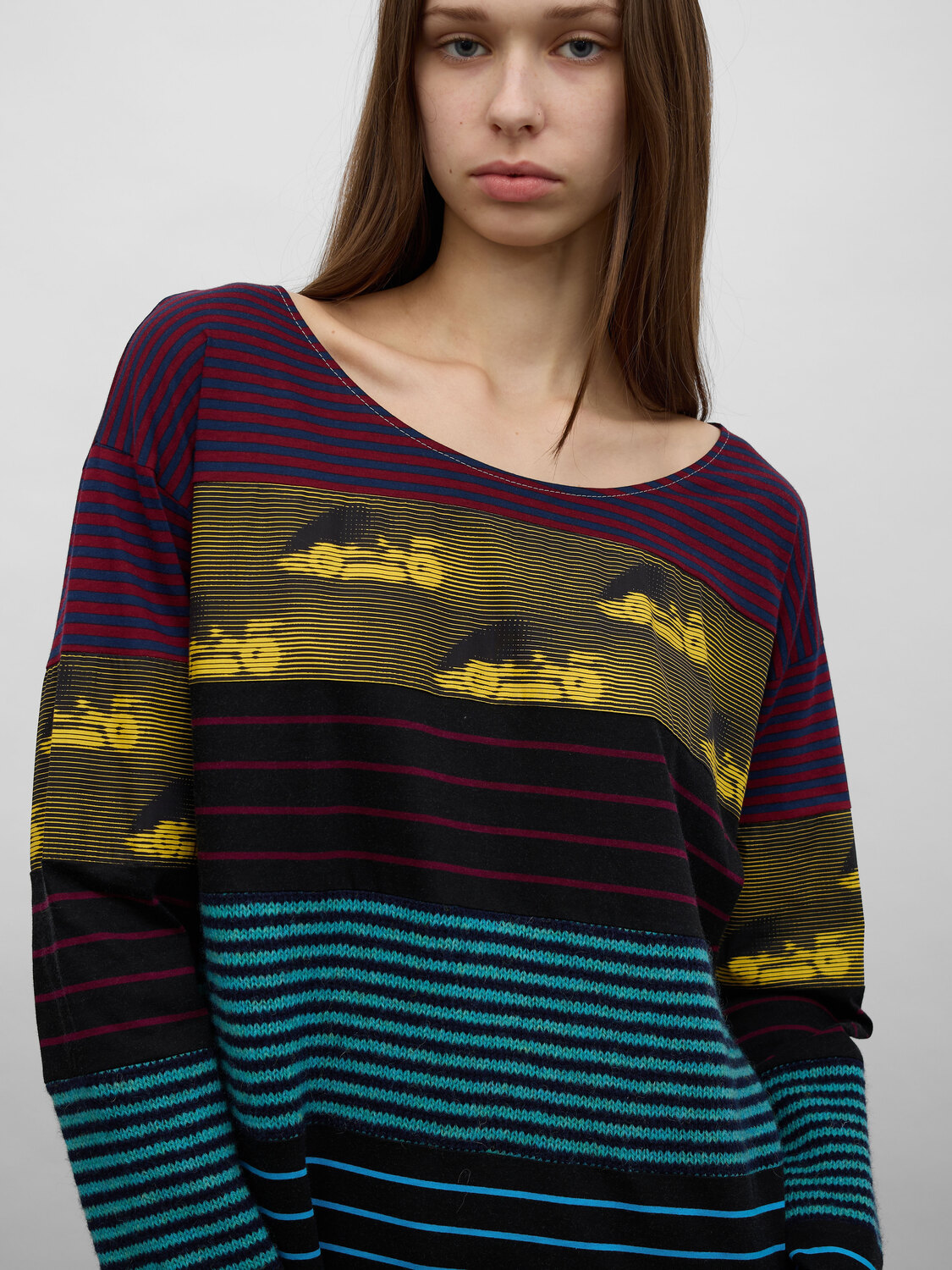 Prada SS16 multicolour striped cotton jersey top with knit inserts and a motion blur effect race car print.