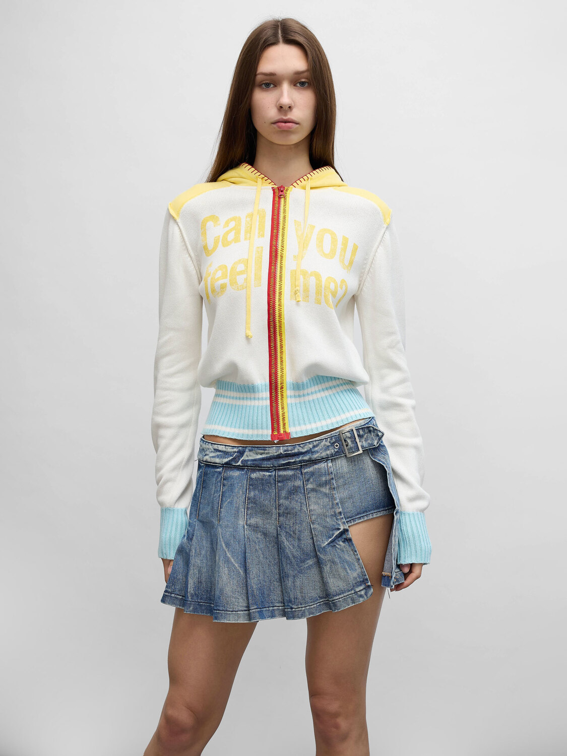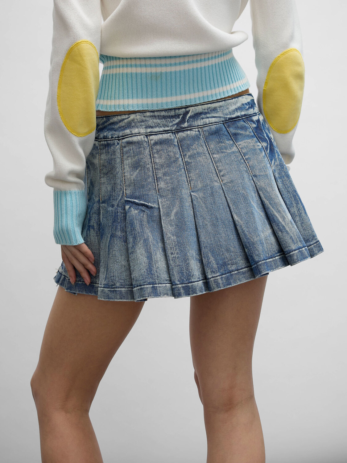 Replay light blue distressed-effect washed denim pleated wraparound mini skort. Integrated denim shorts with zipper closure and a grommeted skirt belt with silver-tone metal buckle.