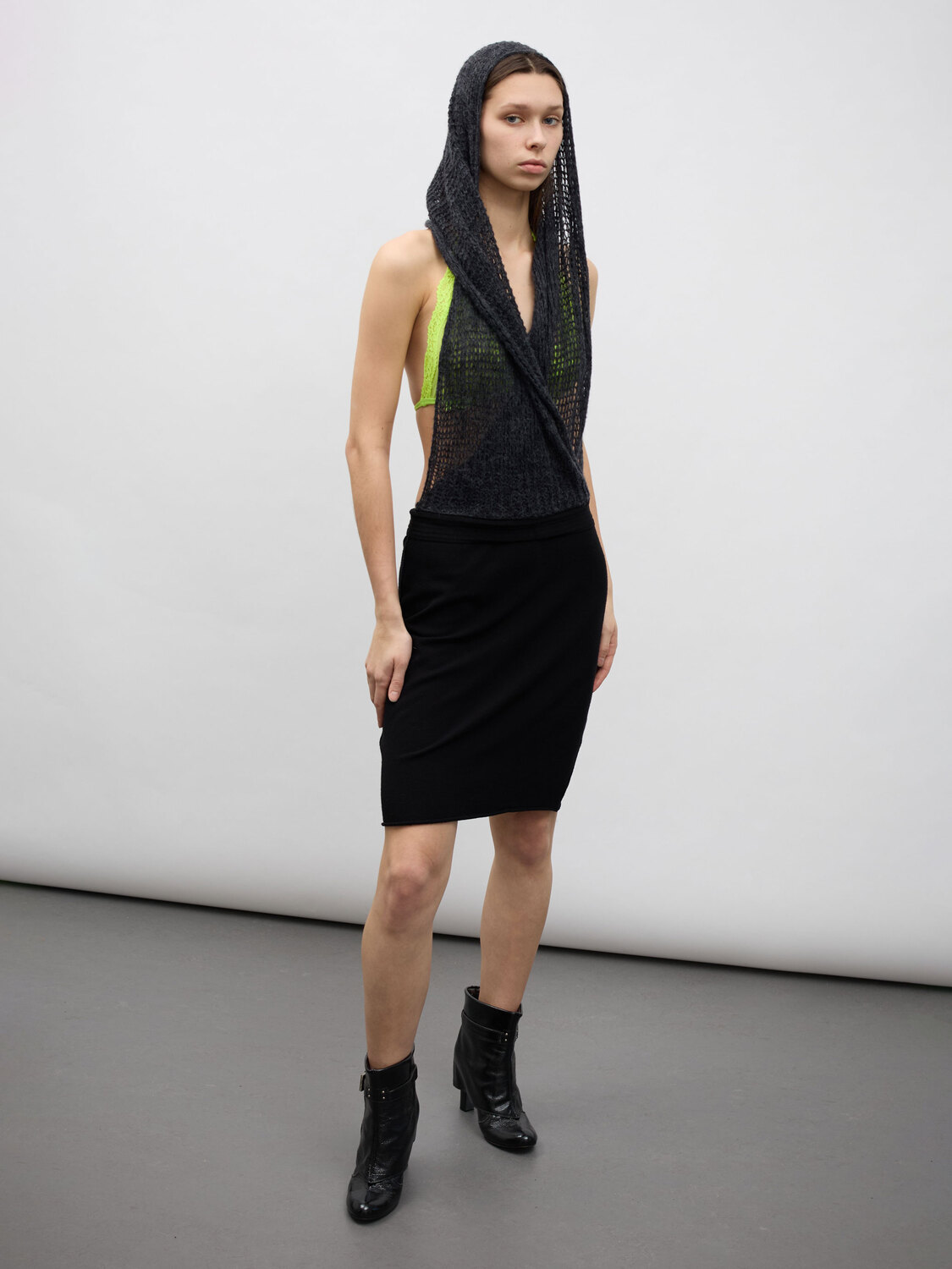 Sarah Pacini black knit midi skirt with a grey open-knit halter hood.