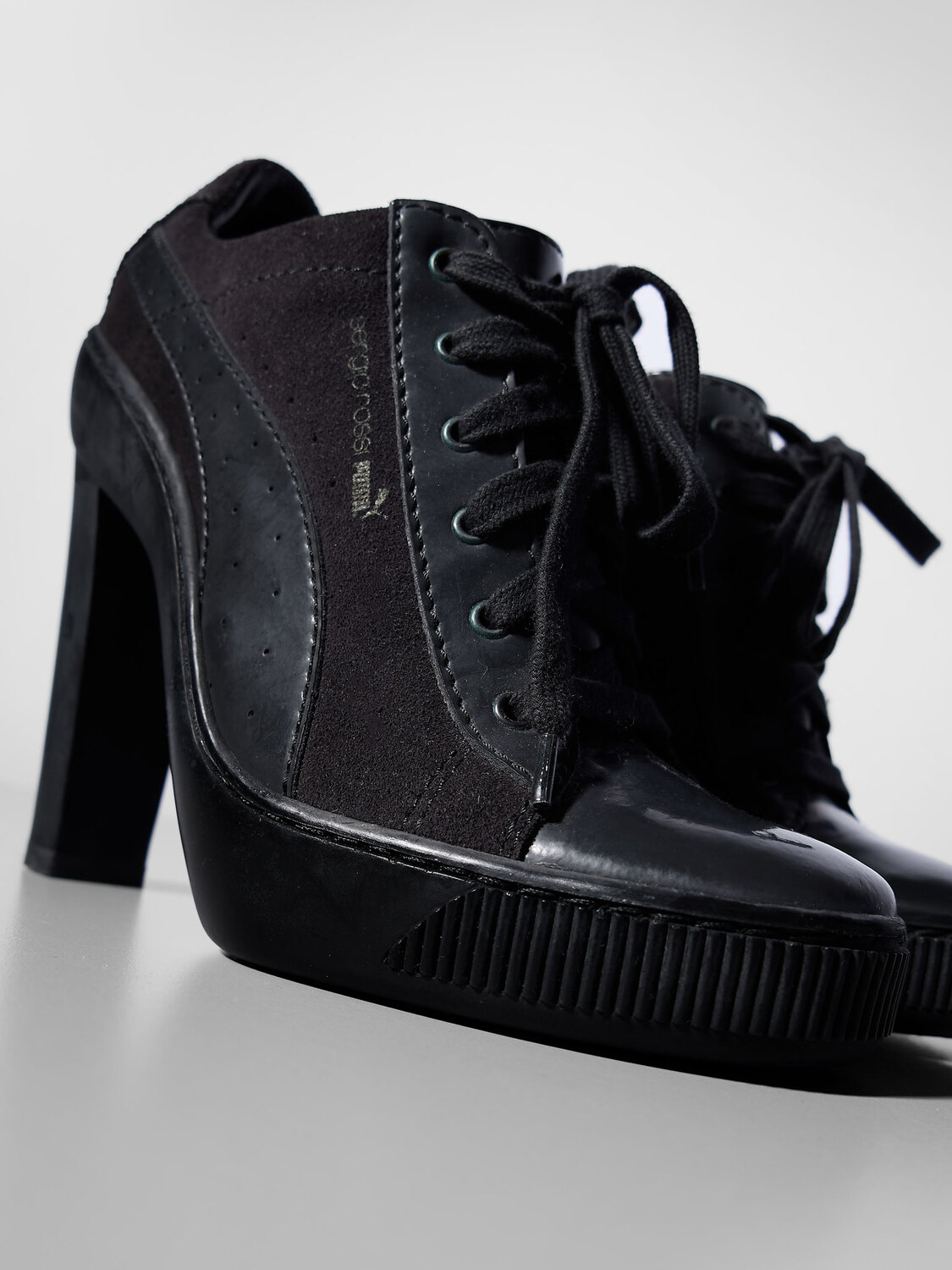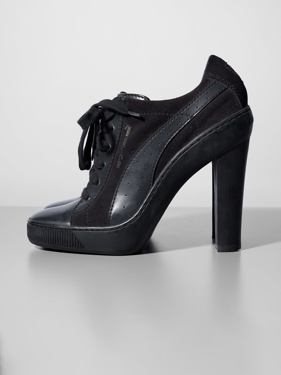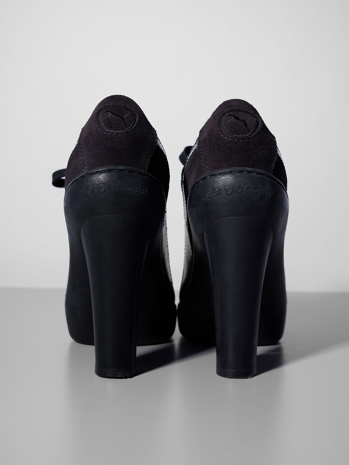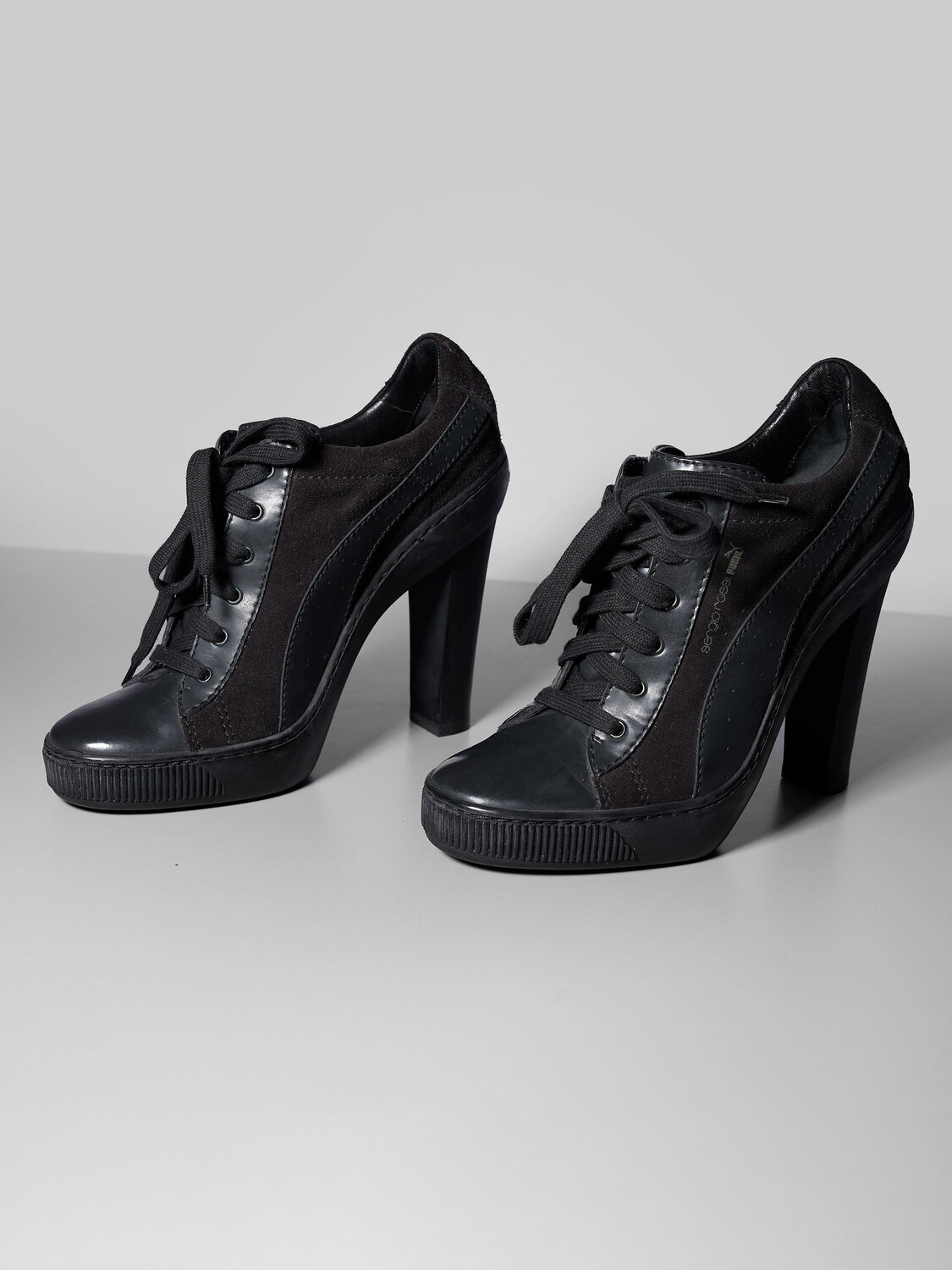 Sergio Rossi x Puma black leather and suede lace-up sneaker heels.