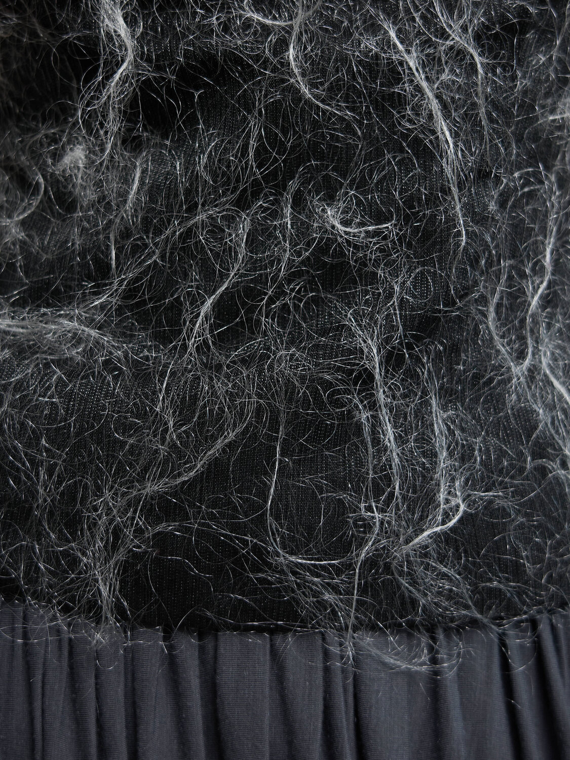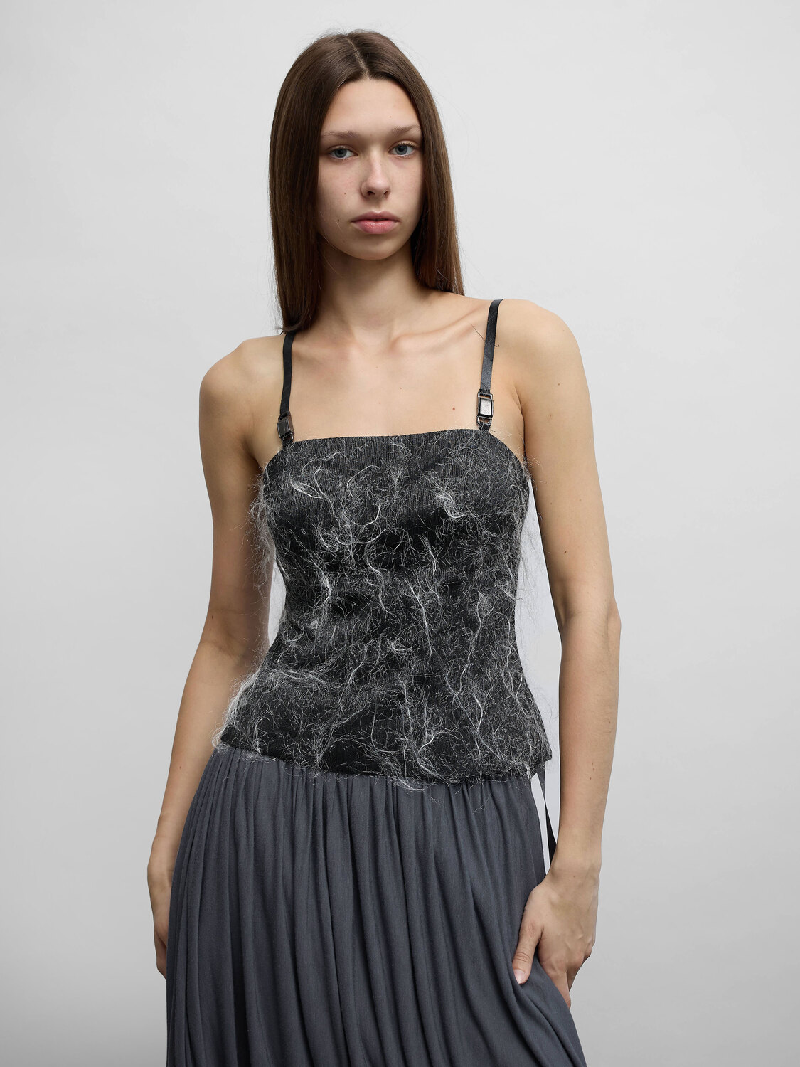 Silver grey fuzzy bustier with button closure at the back and adjustable straps.