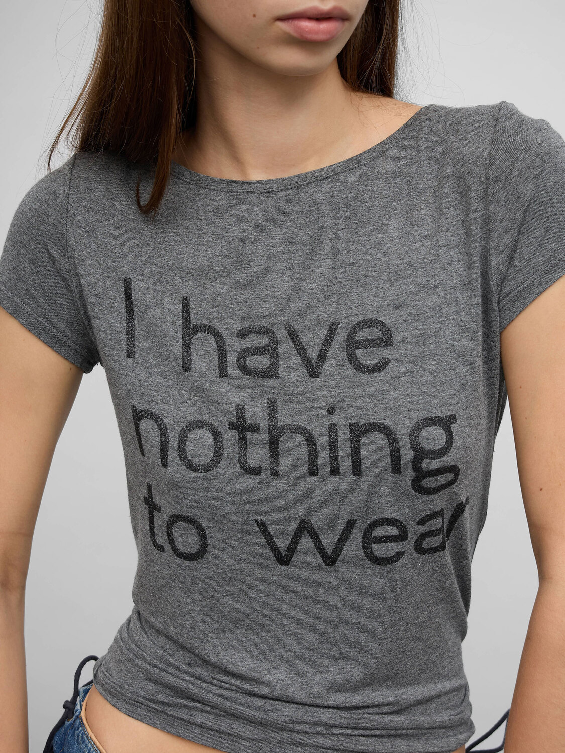 Stefanel grey stretchy T-shirt with “I have nothing to wear” print.