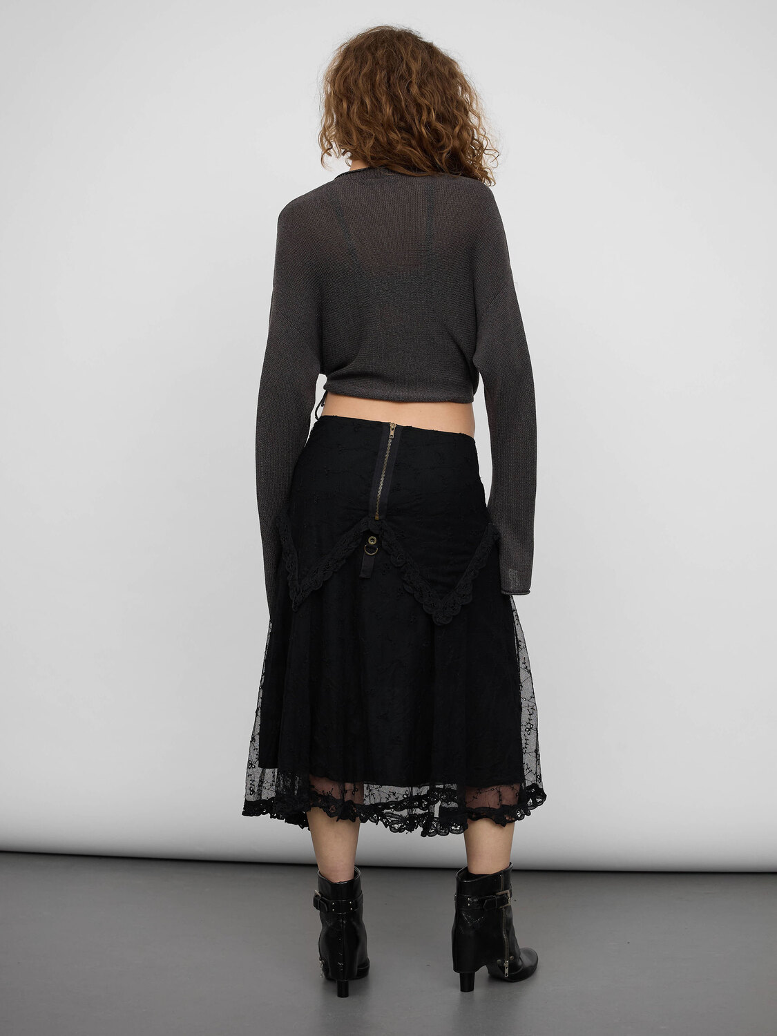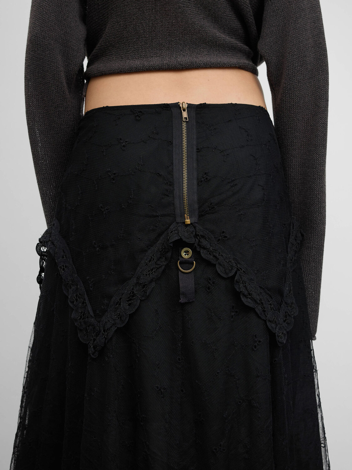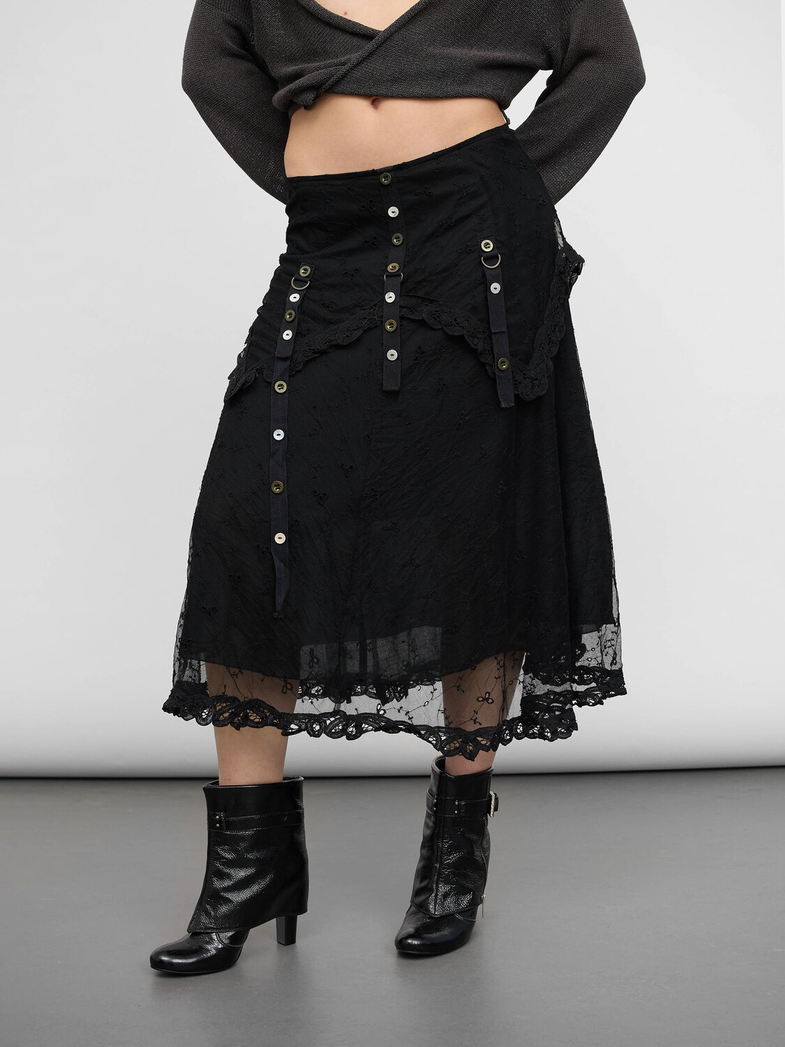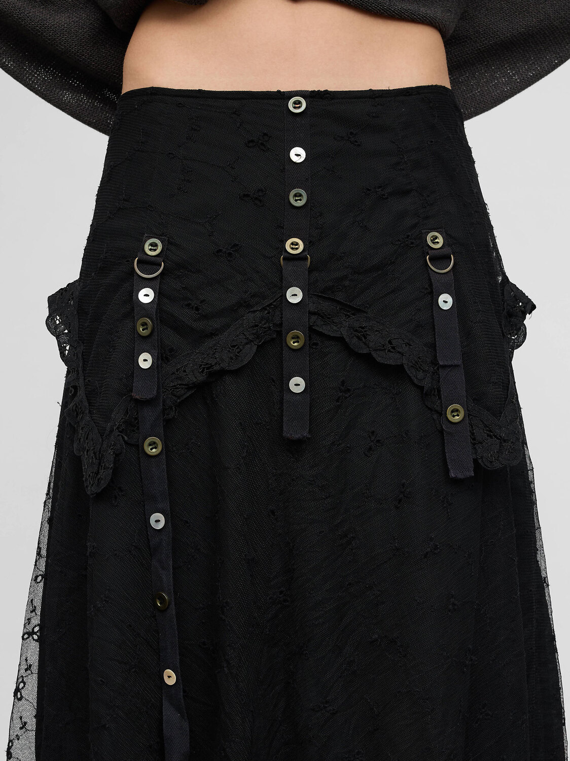 Stefanel black lace midi skirt. Decorative canvas straps with buttons. Light cotton lining. Zipper at the back.