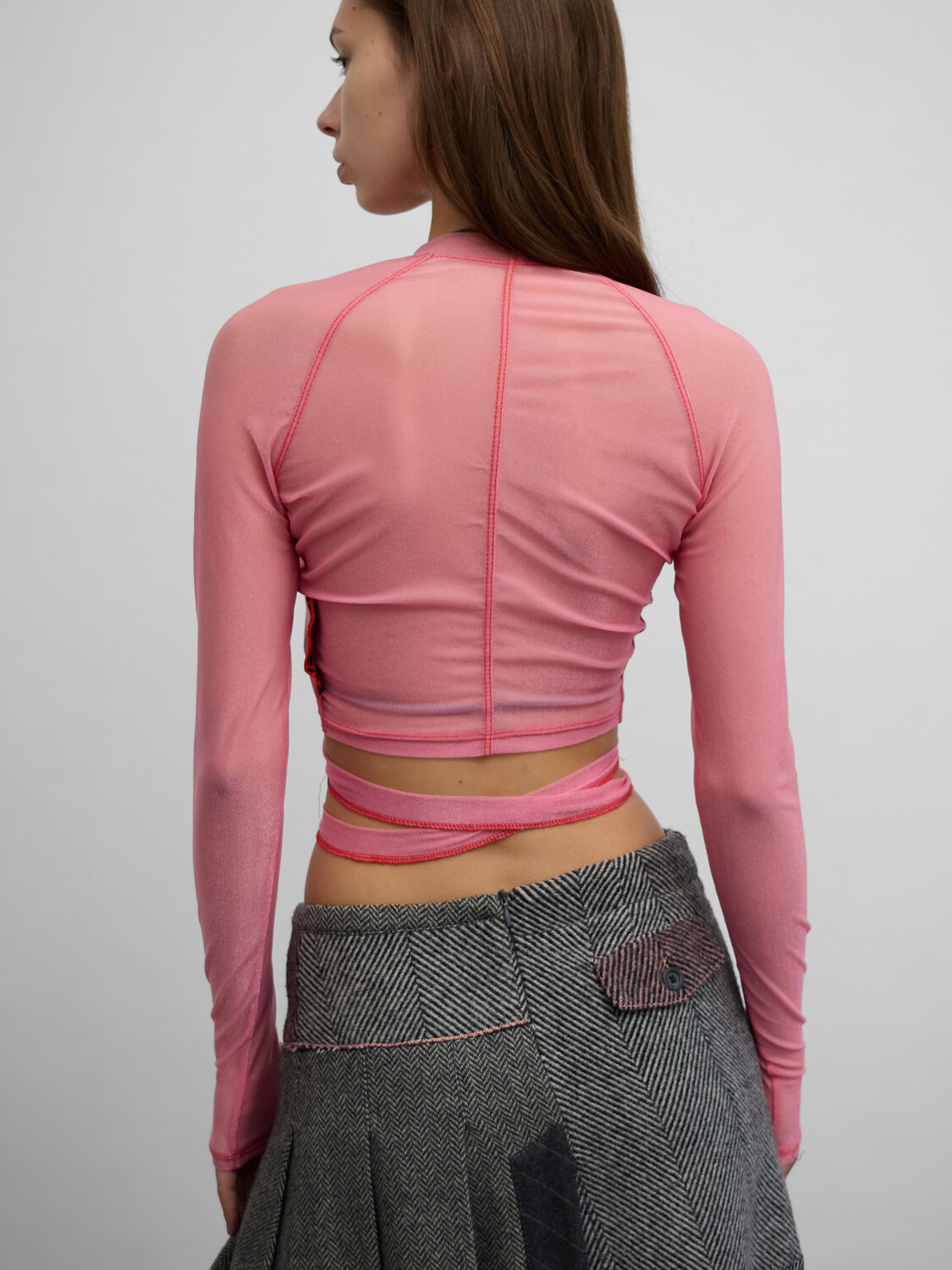 XULY.Bët pink stretchy sheer mesh wrap around cropped cardigan with contrast red stitching.